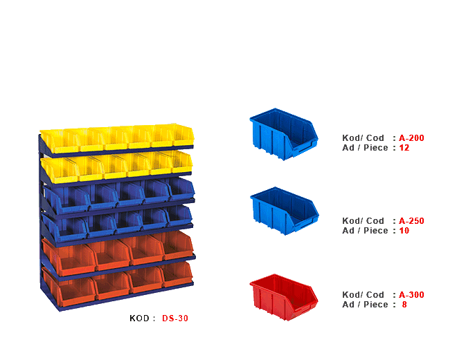 Bu sistem içerisinde yer alan 30 adet farklı boyuttaki kutu atölyede tam bir düzen sağlar. Set içindeki 12 adet A-200, 10 adet A-250 ve 8 adet A-300 kutu, her boyuttaki parçayı ayrı bölmelerde tutar. Birinci sınıf hammadde seçimi sayesinde plastik kutular asla esneme yapmaz. Aslında metal şase ile birleşen bu kutu grubu, en yoğun üretim günlerinde bile tıkır tıkır işler. Üstelik DS 30 avadanlık standı operasyonel hızınızı hissedilir şekilde yukarı taşır. Kutuların ergonomik ön yüz tasarımı sayesinde aradığınız parçaya erişiminiz sadece saniyeler sürer. Personel ihtiyaç duyduğu her malzemeyi panel üzerinden hemen seçer ve işine kesintisiz devam eder. Bu akış üretim bandındaki aksamaları tamamen engeller.