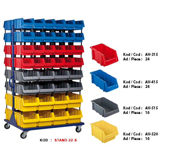 Sistem içindeki 80 adet farklı boyuttaki kutu atölyede kusursuz düzen sağlar. Zira çift yönlü tasarım sayesinde standın her iki tarafını da aynı anda kullanırsınız. Sonuç olarak AV-315, AV-415 ve AV-520 serisi kutular her boyuttaki parçayı başarıyla ayırır. Hatta birinci sınıf hammadde seçimi sayesinde plastikler en ağır yüklerde bile asla esneme yapmaz. Üstelik STAND 22S avadanlık standı operasyonel hızınızı hissedilir şekilde yukarı taşır. Kutuların ergonomik yerleşimi sayesinde aradığınız malzemeye erişim saniyelere iner. Personel ihtiyaç duyduğu her parçayı panel üzerinden hemen seçer. Bu sayede işine kesintisiz devam eder.