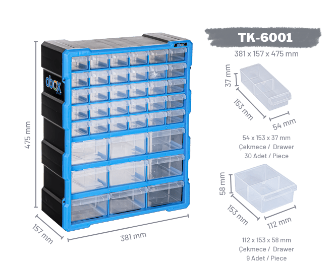 30 Adet 54x153x37 mm ve 9 Adet 112 x 153 x 58 mm çekmecelidir.