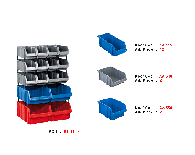Bu dikey sistem içerisinde yer alan 16 adet farklı hacimli kutuyla atölyede kusursuz bir düzen sağlar. Set içindeki 12 adet AV-415 kutu küçük vidaları ve pulları, AV-550 modelleri ise daha büyük yedek parçaları başarıyla ayırır. Birinci sınıf hammadde seçimi ağır yükler altında bile kutu yapısında asla esneme yapmaz. Aslında en yoğun üretim günlerinde bile sisteminiz tıkır tıkır işler. Üstelik ST 1160 avadanlık standı operasyonel hızınızı hissedilir şekilde yukarı taşır. Kutuların geniş ağız tasarımı sayesinde ihtiyacınız olan her boyuttaki parçaya erişiminiz sadece birkaç saniye sürer. Personel her malzemeyi panel üzerinden hemen seçer ve kesintisiz çalışmaya devam eder. Bu akış üretim bandındaki duraksamaları tamamen engeller.
